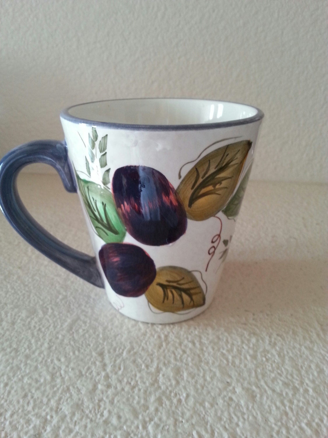 Vintage Fruit by Oneida - Sterling Shop Vintage Fruit by Oneida, Stoneware Mug, Active Pattern: No, Circa: 2001, Size: 4" High, 5" Wide, 3-1/2" Rim Diameter, 2-3/8" Base, Hand painted fruit and leaves on a tan background with a blue trimmed edge., Individual sized cup with handle used for drinking hot liquids. Sale Price: $10.00 This product not eligible for free shipping.