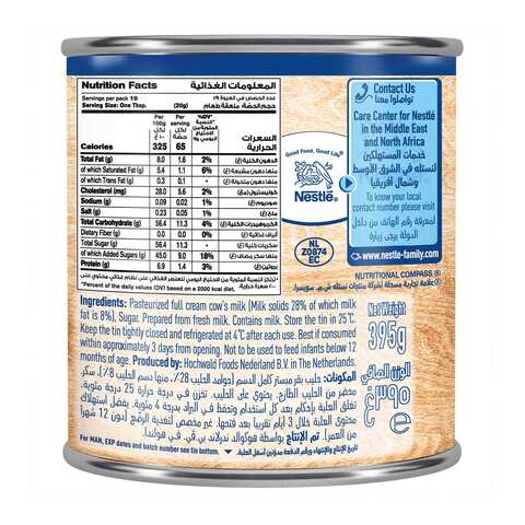 NESTLÉ Sweetened Condensed Milk Can | Nestlé Professional NESTLÉ Sweetened Condensed Milk Can 395g x 18 The ideal ingredient to create sweet indulgences that tempt the taste buds. Nestlé Code: 12210608 Print Technical Sheet Nutritional Value Use & Storage Logistic Datas Preparation Ingredients Milk, Sugar. Allergens Milk and milk products. Nutritional Fact NESTLÉ