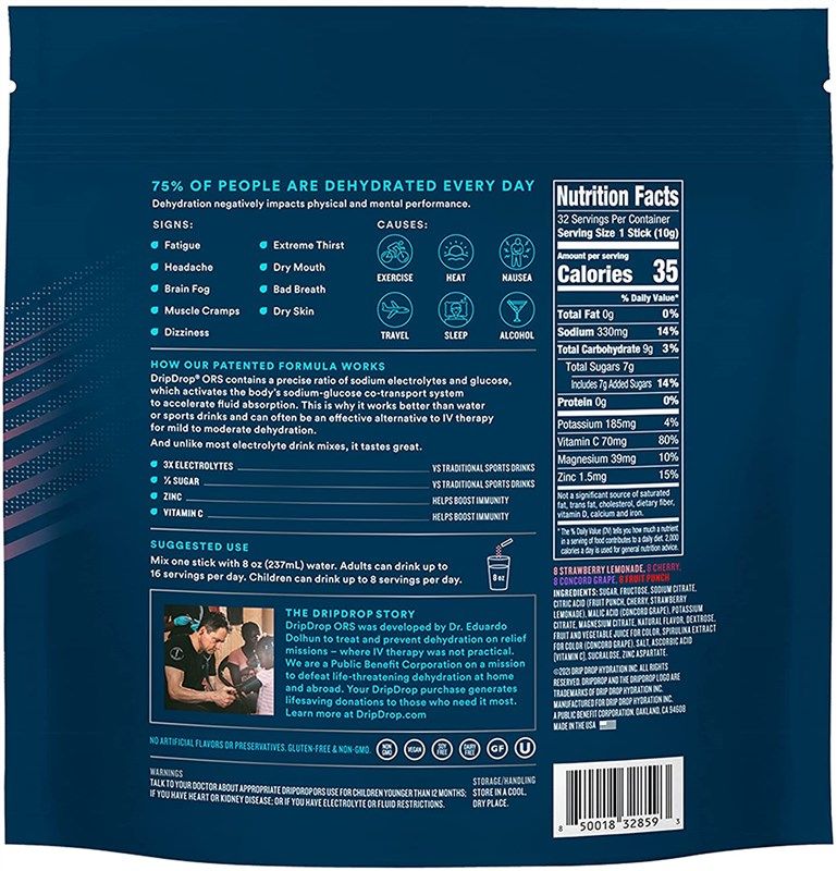 Amazon.com: DripDrop ORS Electrolyte Hydration Powder Sticks, Berry ... PATENTED, DOCTOR-CREATED FORMULA - Born on a relief mission, DripDrop ORS was created by a doctor and formulated with a patented mix of electrolytes & glucose to deliver fast dehydration relief. Also contains potassium, magnesium, zinc, and Vitamin C for maximum benefit.