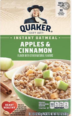 Quaker Instant Oatmeal, Apples & Cinnamon, Breakfast Cereal, 15.1 Ounce ... Quaker Instant Oatmeal, Apples & Cinnamon, Breakfast Cereal, 15.1 Ounce, (Pack of 4) Visit the Quaker Store 232 ratings | 5 answered questions Nutrition summary 1.0 servings per container | 1 Packet (43 g) Nutrition facts Ingredients About this item Includes 40 packets (4 boxes, 10 packets per box)
