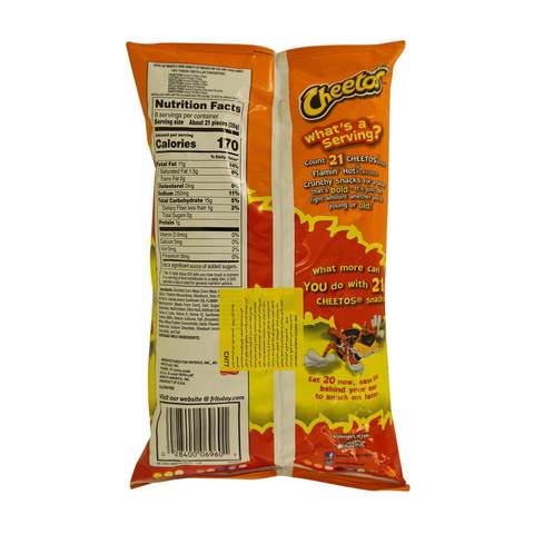 Cheetos Flaming Hot Crunchy (67.3g)2 3/8 - MyFitnessPal Find calories, carbs, and nutritional contents for Cheetos Flaming Hot Crunchy ... Fritolay(the Whole Bag). Cheetos Flaming Hot Crunchy (67.3g)2 3/8.