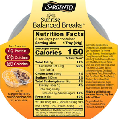 Sargento Balanced Breaks, Sharp White Cheddar Cheese ... - Fooducate Examples that appear on food labels are sulfur dioxide, sodium bisulfite, sodium sulfate, and potassium bisulfite. ... Personalized health review for Sargento Balanced Breaks, Sharp White Cheddar Cheese, Cashews and Raisin: 180 calories, nutrition grade (C plus), problematic ingredients, and more. ... 180 calories, nutrition grade (C plus ... Sargento, Balanced Breaks Snacks Nutrition - Eat This Much Amount of Iron in Sargento, Balanced Breaks Snacks: Iron 0.7mg. 9%. Fatty acids. Amino acids. * The Percent Daily Values are based on a 2,000 calorie diet, so your values may change depending on your calorie needs. Report a problem with this food. Find on Amazon. Balanced Breaks® | Sargento Sargento ® Sweet Balanced Breaks ® Natural Cheddar Cheese, Sea-Salted Roasted Almonds, Raisins and Greek Yogurt Flavored Drops, 3-Pack Sargento ® Sweet Balanced Breaks ® Monterey Jack Natural Cheese, Dried Cranberries and Dark Chocolate Covered Peanuts, 3-Pack